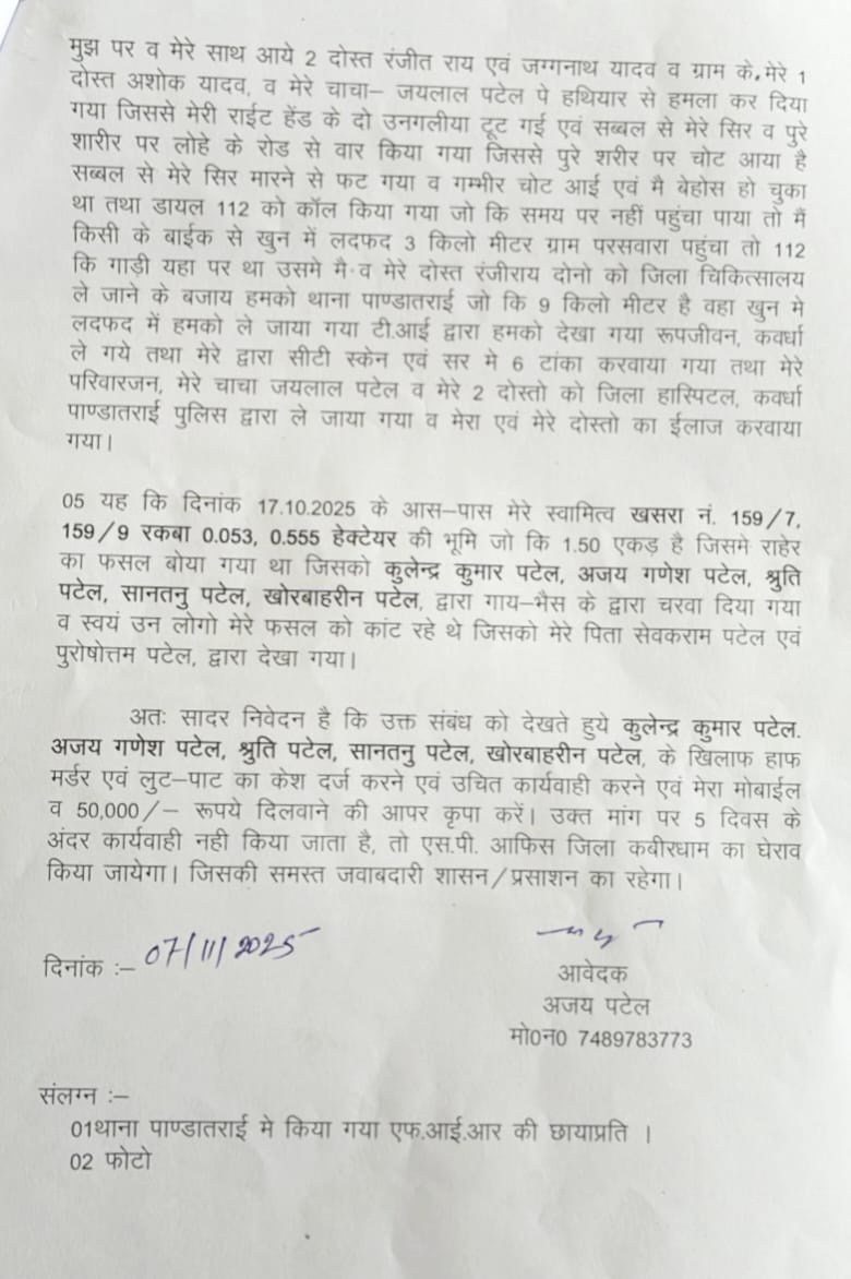 कवर्धा: ग्राम लडुवा में ज़मीन विवाद को लेकर जानलेवा हमला — घायल ने SP से की न्याय की मांग