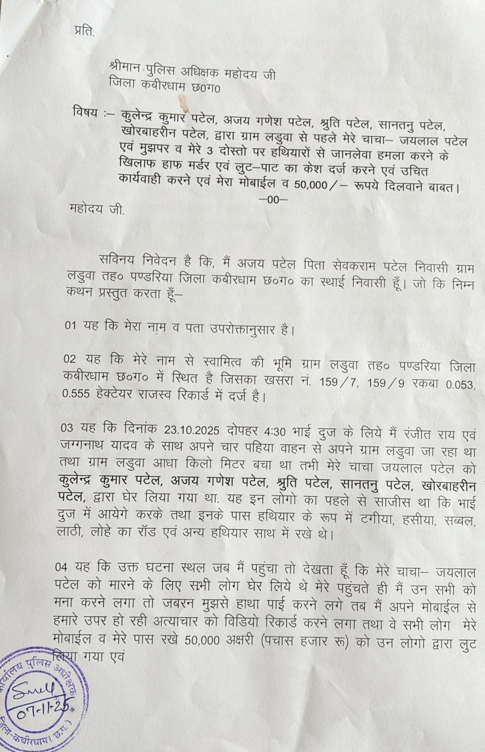कवर्धा: ग्राम लडुवा में ज़मीन विवाद को लेकर जानलेवा हमला — घायल ने SP से की न्याय की मांग